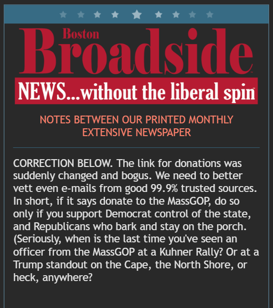 The Boston Broadside sent out an email alleging that the MassGOP donation link setup for the Trump Campaign was a scam which was sent out in an email associated with my name. This accusation stemmed from a temporary issue with the link, which was quickly resolved. I want to clarify that the link in question is legitimate, and all 100% of donations made through it are used exclusively for the Trump Campaign.