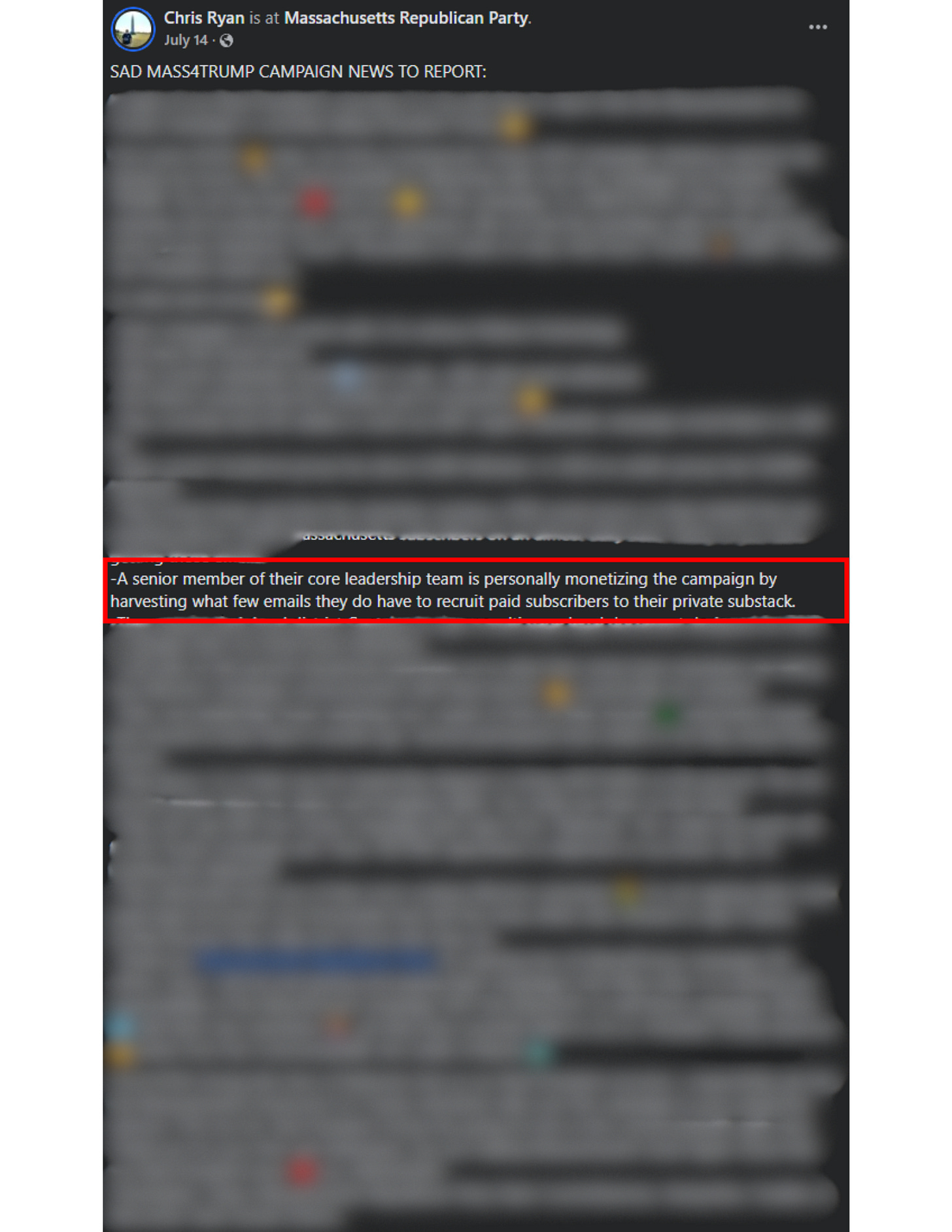 Chris Ryan, the chairman of the WMA-GOP Patriot PAC and State Committee man is no longer a part of the Trump Campaign Team, has accused me of misusing campaign data for personal gain. On July 14th, he posted on Facebook alleging, “A senior member of their core leadership team is personally monetizing the campaign by harvesting what few emails they do have to recruit paid subscribers to their private Substack.” I want to make it unequivocally clear: I do not profit or use any data associated with the Trump Campaign. I am a volunteer, and my involvement is strictly professional and driven purely by my commitment to the cause.